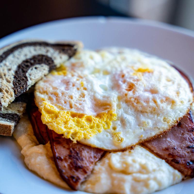 Ham steak & two eggs your style. Smothered with red eye gravy, grits & toast